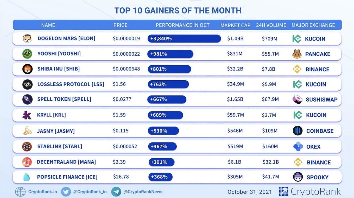$ELON saw the largest percentage increase of any token during Oct 2021 with a 3,840% gain according to CryptoRank. We did it!