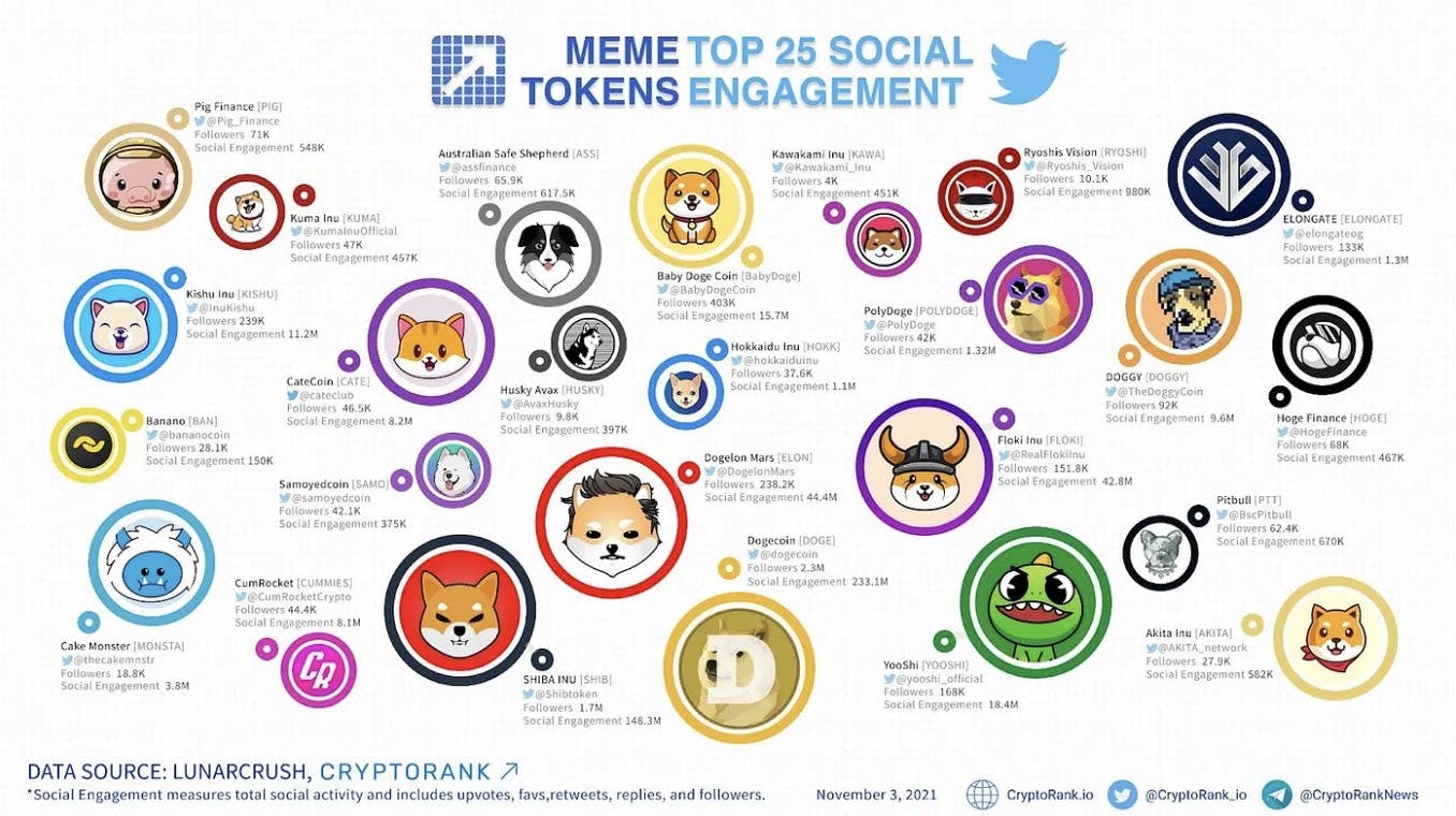 Dogelon Mars is ranked as the 3rd highest social engagement of all Meme tokens with 44.4M engagements. Behind only SHIB with 138.3M & DOGE with 233.1M engagements.