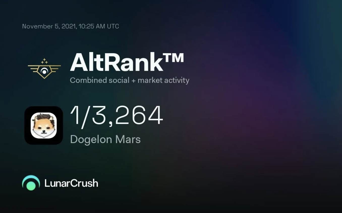LunarCrush ranks Dogelon Mars #1 among 3264 altcoins, based on combined social and market activity. LunarCrush is a data analytics site providing real time social insights & market metrics.